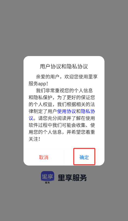 1、首次启动APP会显示用户协议弹窗,点击"同意"按钮后即可进入社区服务平台主界面。