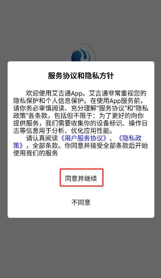 1、首次启动艾吉通APP时,系统会弹出用户协议确认窗口,点击"同意"按钮后方可进入登录页面。