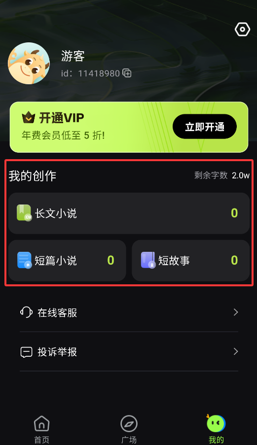 2、"创作中心"提供长篇小说、短篇故事等3种创作模式,适配不同写作需求。