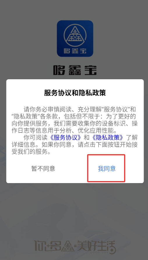 1、首次启动应用会弹出用户协议窗口,必须点击确认按钮才能进入金融服务登录页面。