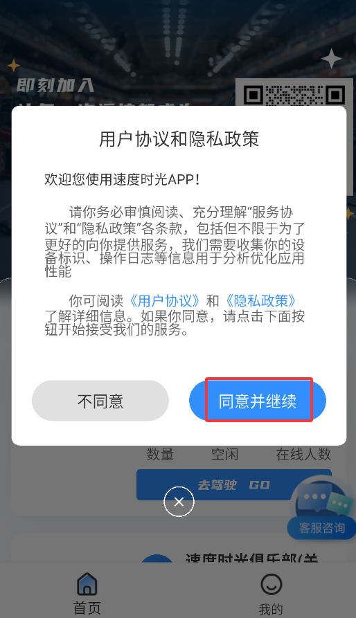 1、首次启动速度时光APP时,系统会弹出用户协议确认窗口,点击"同意"按钮后方可进入应用主界面。