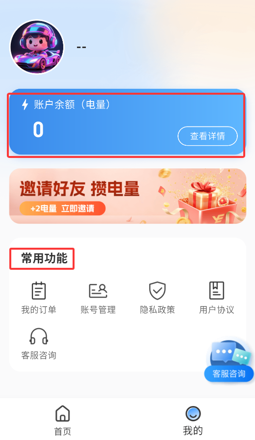 4、个人中心提供账户管理功能,包括余额查询、电量监控、订单记录和账号设置等常用选项。
