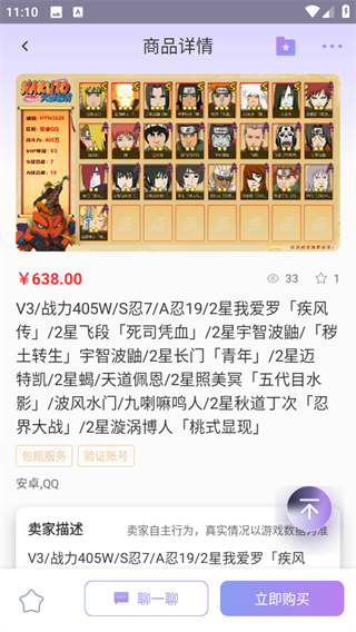 4、选择你感兴趣的账号,查看账号详情与价格,可以与对方聊一聊砍砍价也可以直接购买。