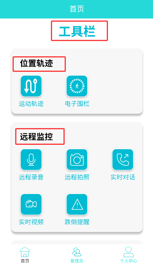 3、安全工具区包含实时定位追踪和远程视频监控功能,支持随时查看被监护人的活动轨迹和周边环境。