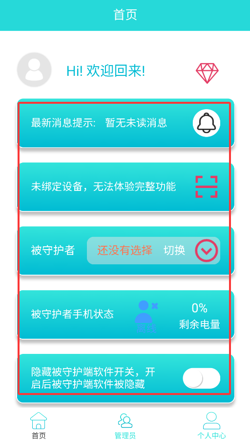 2、首页提供三大核心功能:安全提示设置、被监护人员管理和设备状态监控,方便用户快速掌握监护情况。