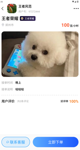 1、展示陪练详细信息,含擅长英雄、历史胜率、用户评价,方便用户精准挑选心仪陪练;