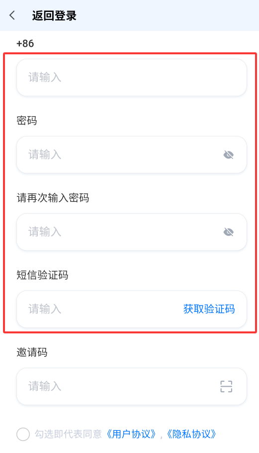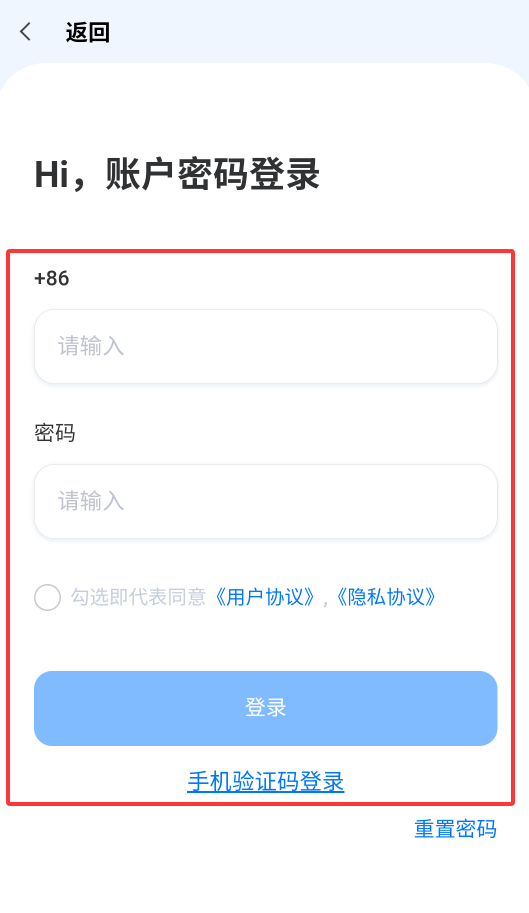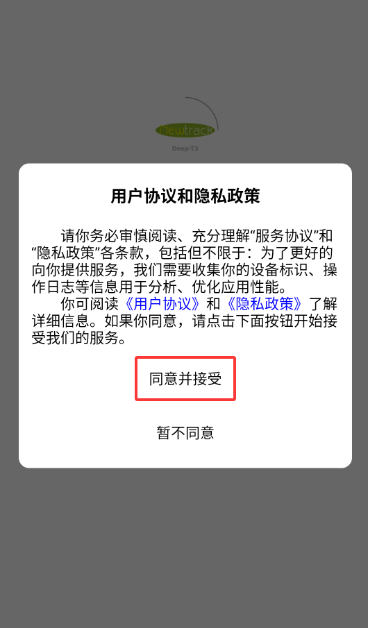 1、首次启动APP会弹出用户协议,点击"同意"后进入登录页面。