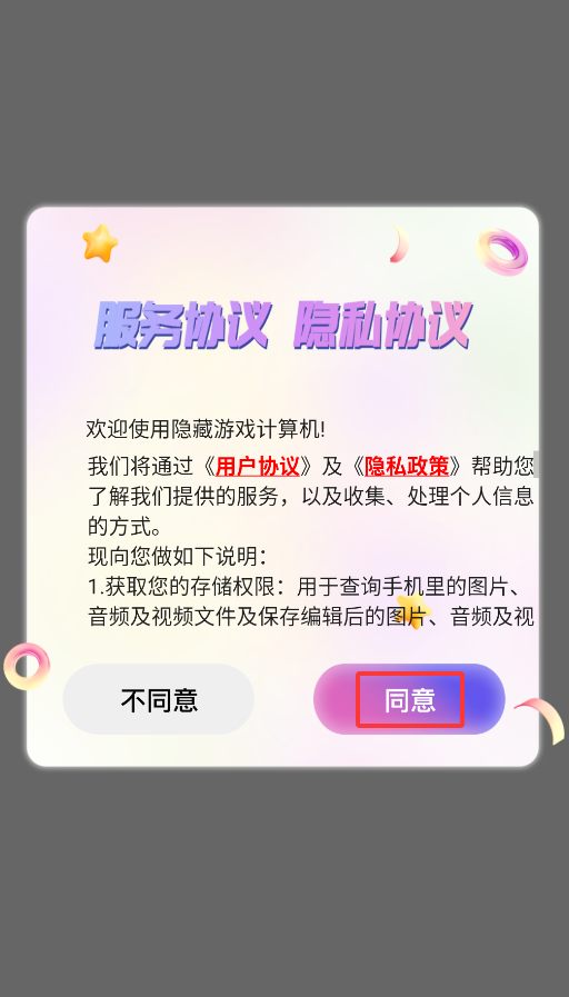 1、首次启动APP会弹出用户协议,点击"同意"后即可进入隐私保护工具主界面。