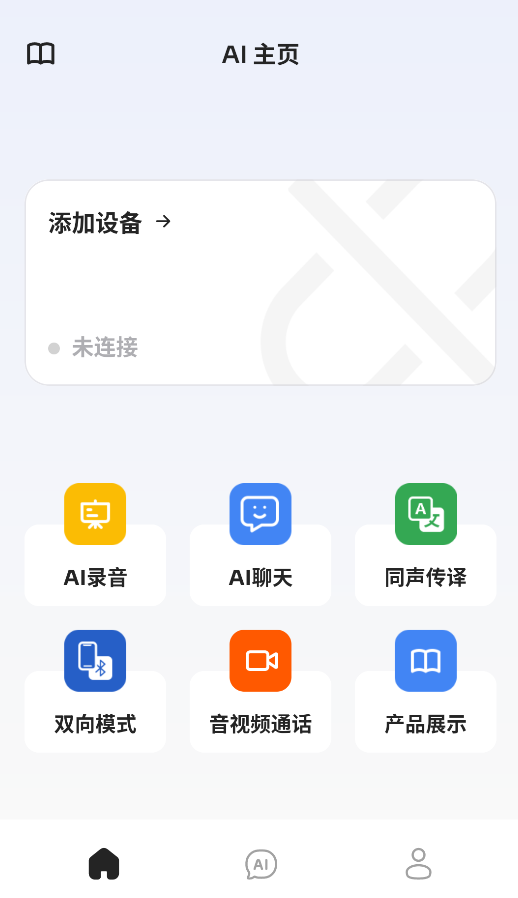 1、启动应用后,主界面提供AI录音、实时翻译、音视频通话等智能交互功能入口。