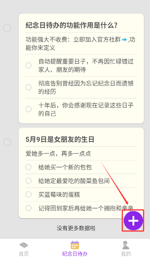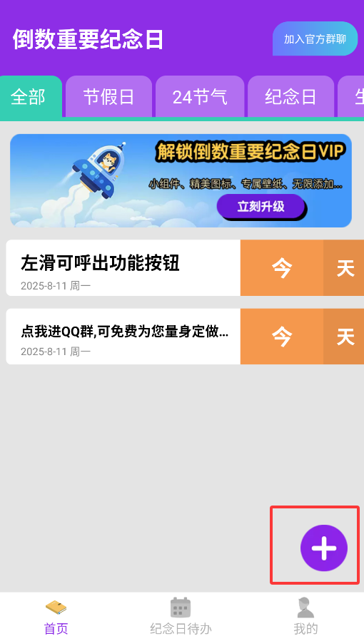 2、在首页点击右下角的"+"按钮,即可开始创建新的纪念日或重要事件提醒。