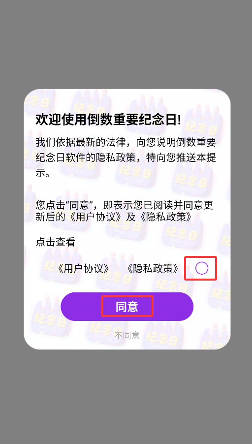 1、首次启动倒数重要纪念日APP时,系统会弹出用户协议确认窗口,点击"同意"按钮后方可进入应用主界面。