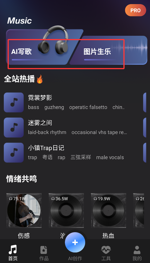 2、首页提供AI智能创作功能,包括AI写歌和图片生成音乐两大核心功能。