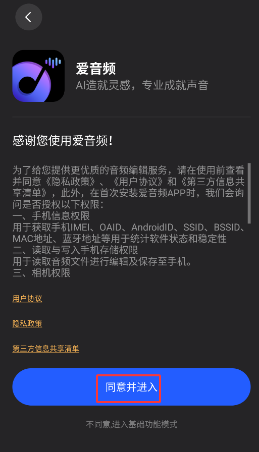 1、首次启动APP时会弹出用户协议,点击"同意"即可进入应用主界面。
