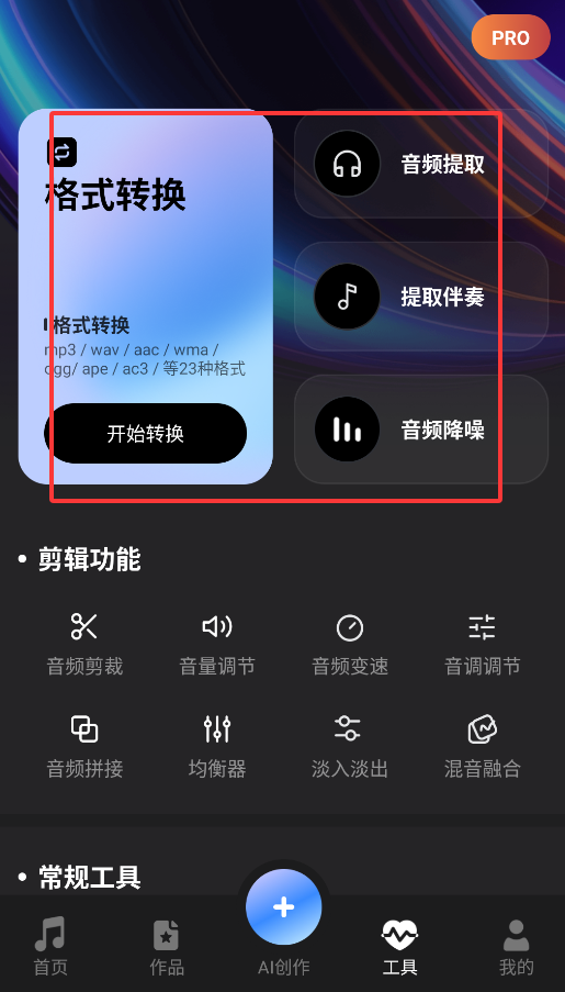 4、音频工具区提供专业功能,支持格式转换、人声提取、伴奏分离等实用操作。