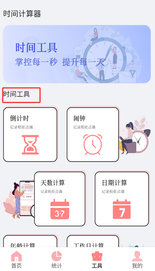 4、实用工具区包含倒计时、闹钟提醒和日期计算等功能,辅助用户进行时间管理。