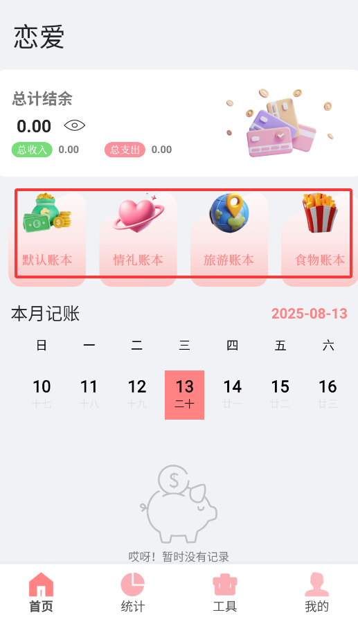2、首页提供多种账本模板,包括日常收支、人情往来、旅行消费和餐饮记录等分类账本。