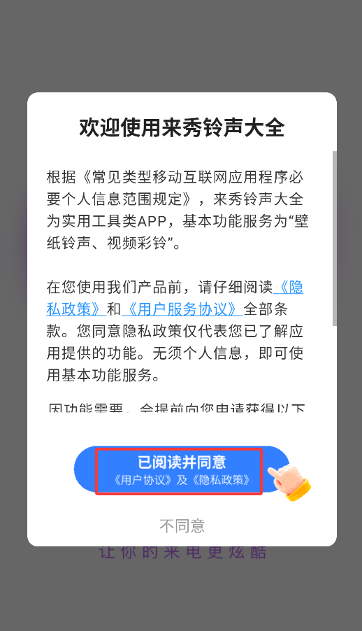1、首次启动APP会显示用户协议弹窗,点击"同意"按钮后即可进入铃声管理平台主界面。