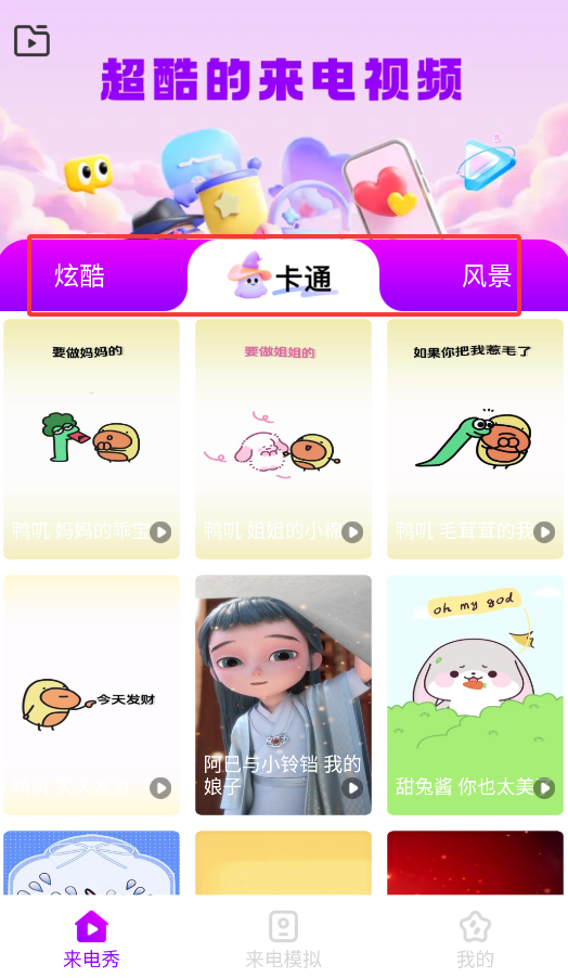 2、"视频库"提供1000+动态来电秀,按炫酷特效、自然风光等8类风格分类。
