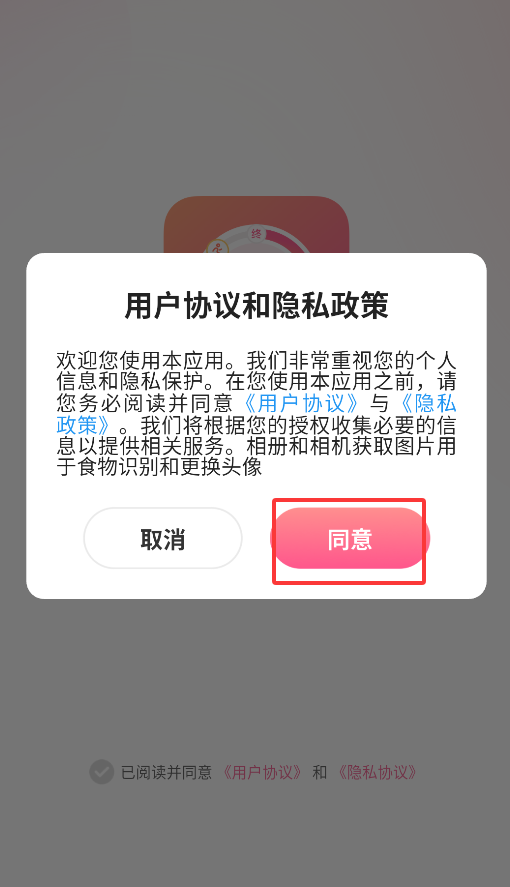 1、首次启动程序会显示用户协议窗口,点击确认后进入健康饮食管理平台。
