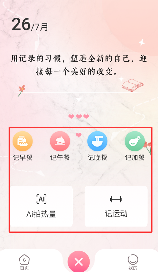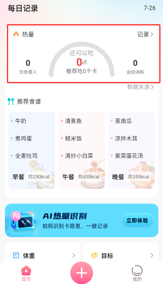 2、主页面展示当日热量收支数据,包括建议摄入量和运动消耗值。