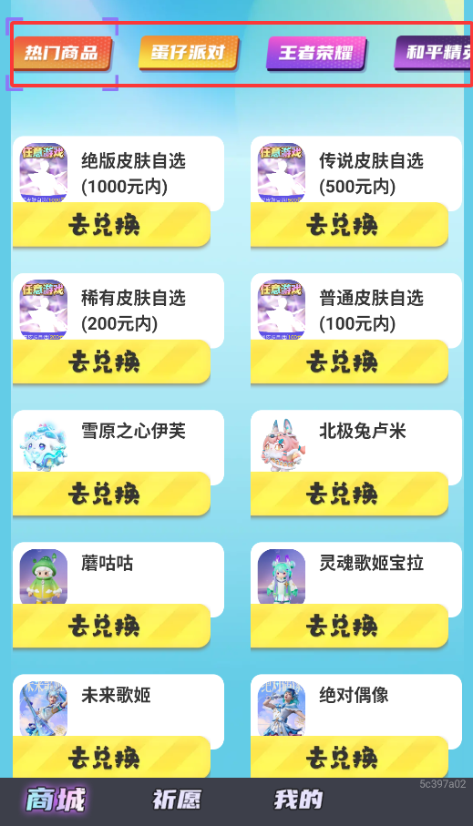 2、在商城页面,可通过热门商品推荐或输入游戏来筛选心仪皮肤,点击对应商品即可兑换。