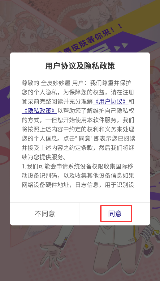 1、首次打开全皮妙妙屋APP时,会弹出用户协议窗口,点击"同意"后即可进入主界面。