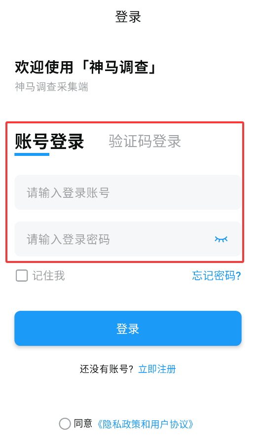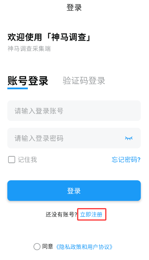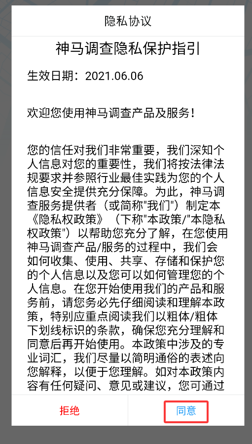 1、首次启动应用会显示隐私协议页面,必须点击"同意"按钮才能进入调查平台主界面。