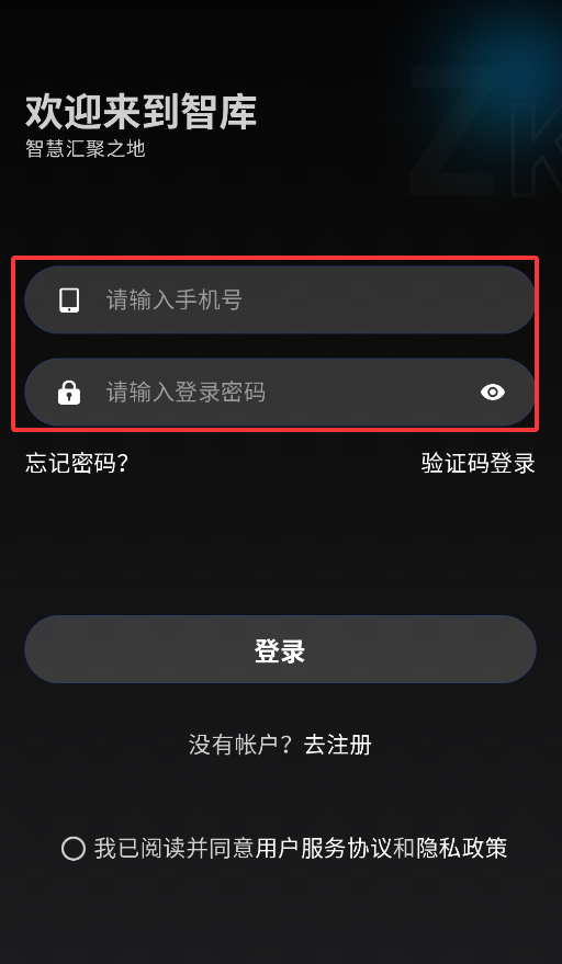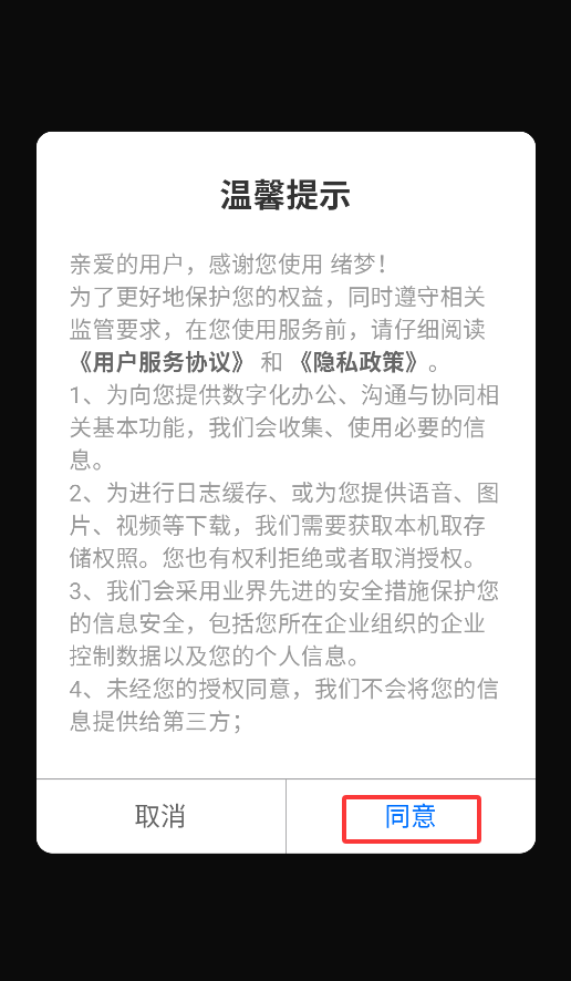 1、首次启动APP会显示用户协议窗口,点击"同意"按钮后进入情感服务平台登录页面。