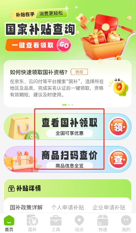 2、首页提供两大核心功能入口:国家补贴申领通道和商品扫码比价服务。