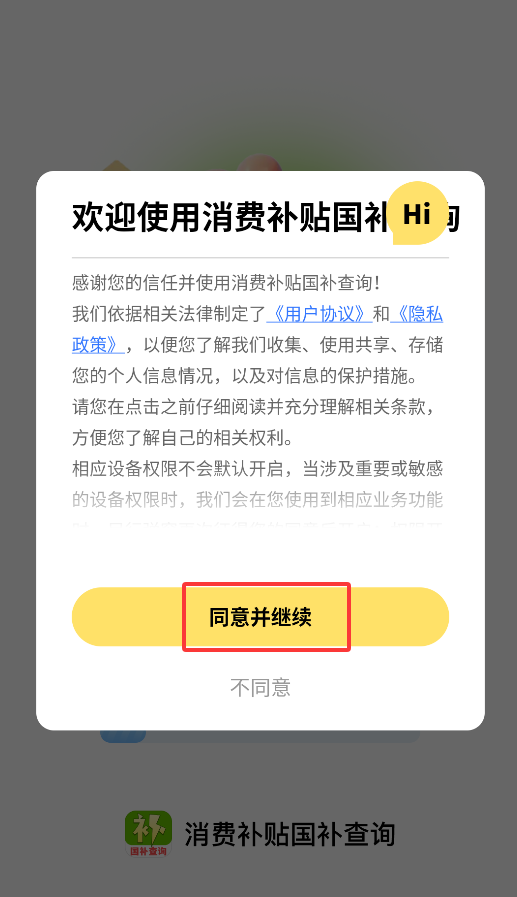 1、首次启动消费补贴国补查询APP时,系统会弹出用户协议确认窗口,点击"同意"按钮后方可进入应用主界面。