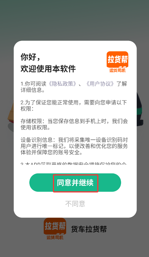 1、首次启动应用会显示用户协议页面,点击"同意"按钮后即可进入货运平台主界面。