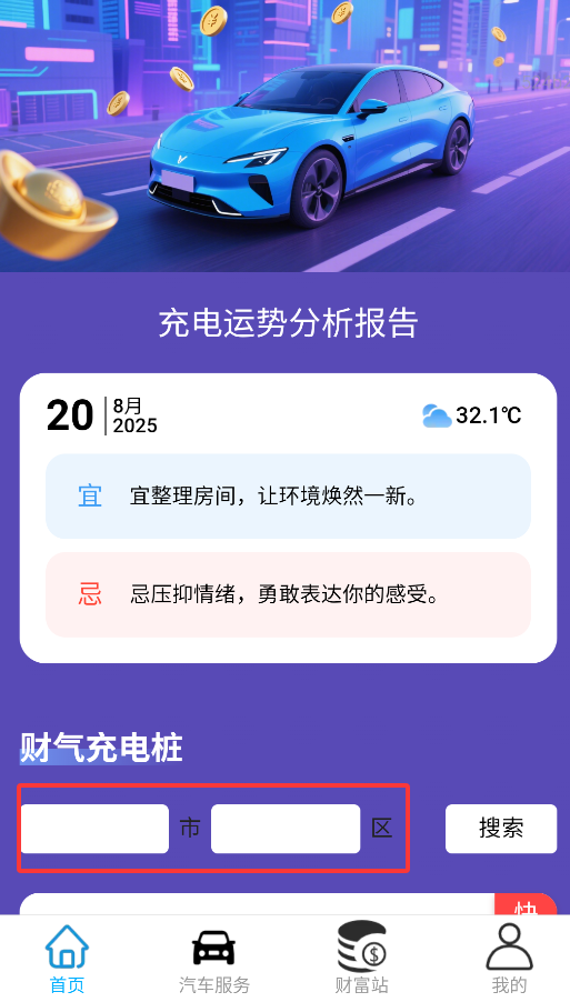 2、首页支持按行政区域(如"北京市海淀区")搜索附近可用充电桩及实时状态查询。