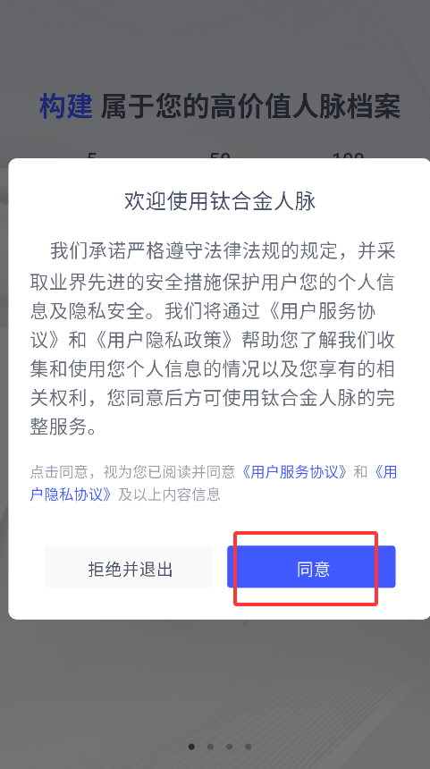 1、首次启动APP会显示用户协议和隐私政策,仔细阅读后点击"同意"按钮进入登录页面。