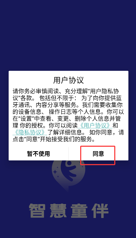 1、首次打开APP会弹出用户协议页面,需要点击"同意"按钮才能进入应用主界面。