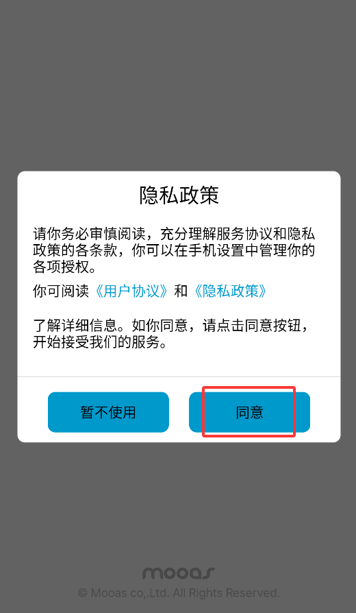 1、首次启动Mooas LED APP时,系统会弹出用户协议窗口,点击"同意"按钮后进入主界面。