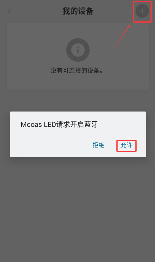3、进入"我的设备"界面后,点击右上角"+"号添加设备,系统会请求开启蓝牙权限,点击"允许"继续。