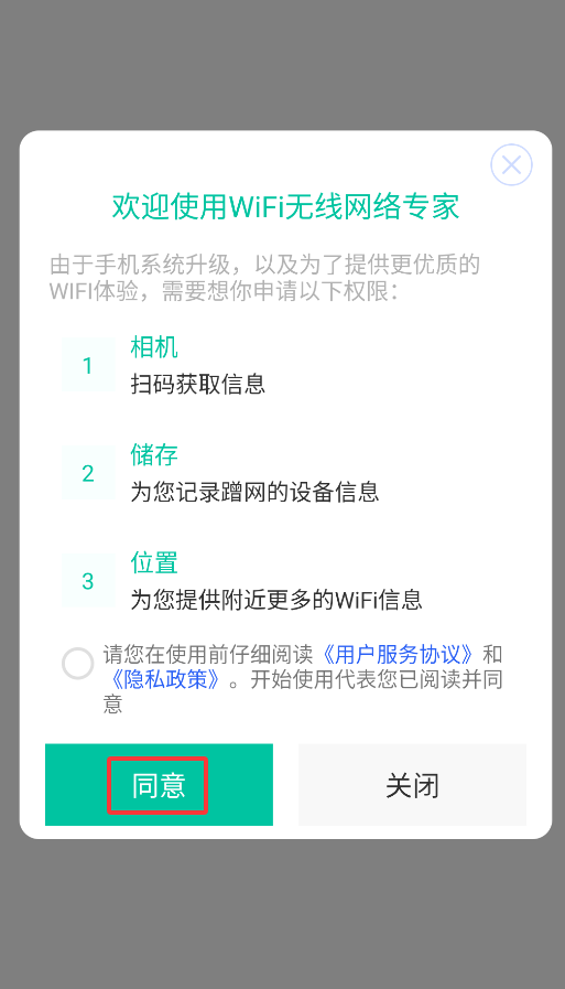 1、首次启动WiFi无线网络专家APP时,系统会弹出权限申请和用户协议,仔细阅读后点击"同意"才能进入主界面。