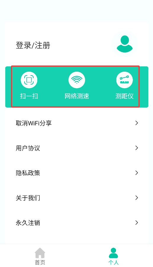 4、个人中心整合了常用工具,包括二维码扫描、网络测速和距离测量等实用功能。