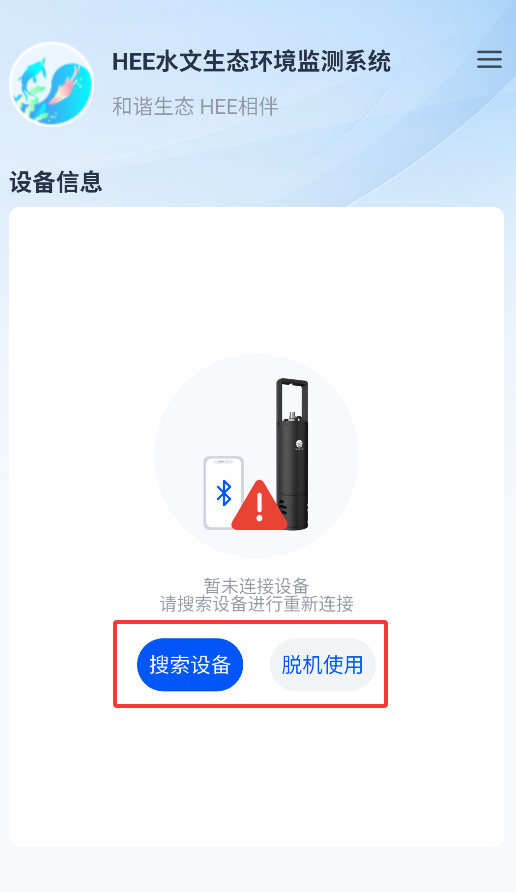 2、首页提供两种工作模式:在线搜索监测设备或选择脱机模式处理本地数据。