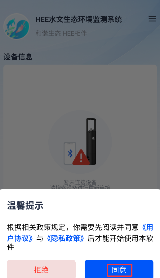 1、首次启动APP会弹出用户协议,点击"同意"后即可进入水文监测系统主界面。