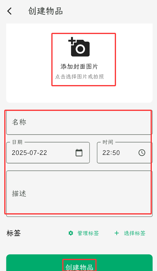 3、创建物品时需上传封面图(支持拍照或相册选择),填写名称、日期、描述及分类标签等详细信息。