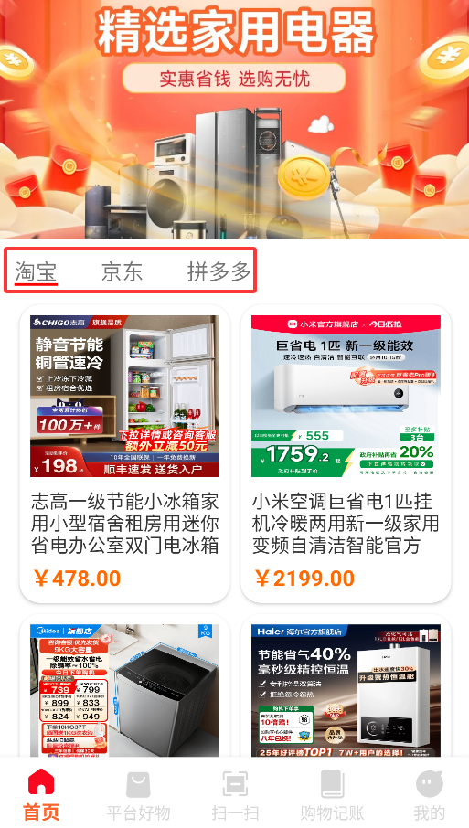 2、首页聚合淘宝、京东等平台的补贴专区,智能推荐高性价比家用电器。