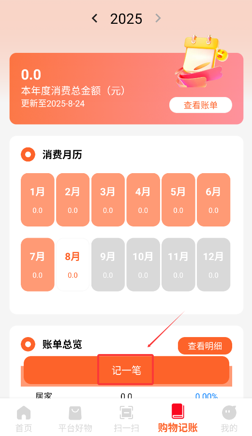 2、内置智能化购物记账统计模块,自动同步平台消费记录并可手动补充条目,生成月度支出报表与消费趋势可视化图表。