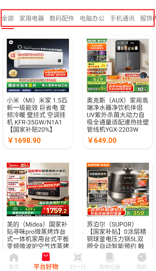 3、"补贴好物"板块分类展示享受政府/平台双补贴的电器、数码、办公设备等商品。