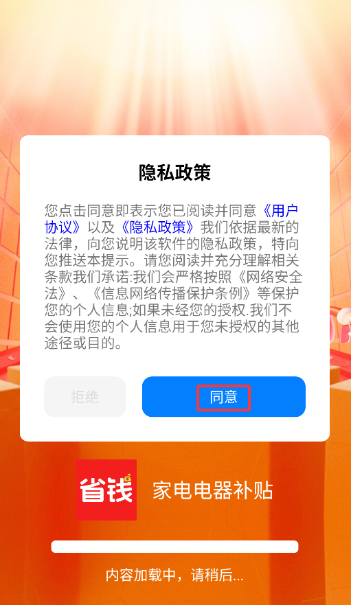 1、首次启动APP会弹出用户协议,点击"同意"后即可进入家电补贴平台主界面。