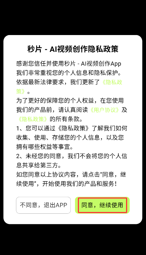 1、首次启动APP会弹出用户协议,点击"同意"后即可进入AI视频创作平台主界面。