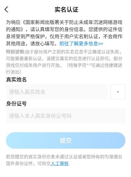 3、若您提交的真实身份信息未通过认证或者您持有的为港澳台国外身份证件,可转交人工审核。