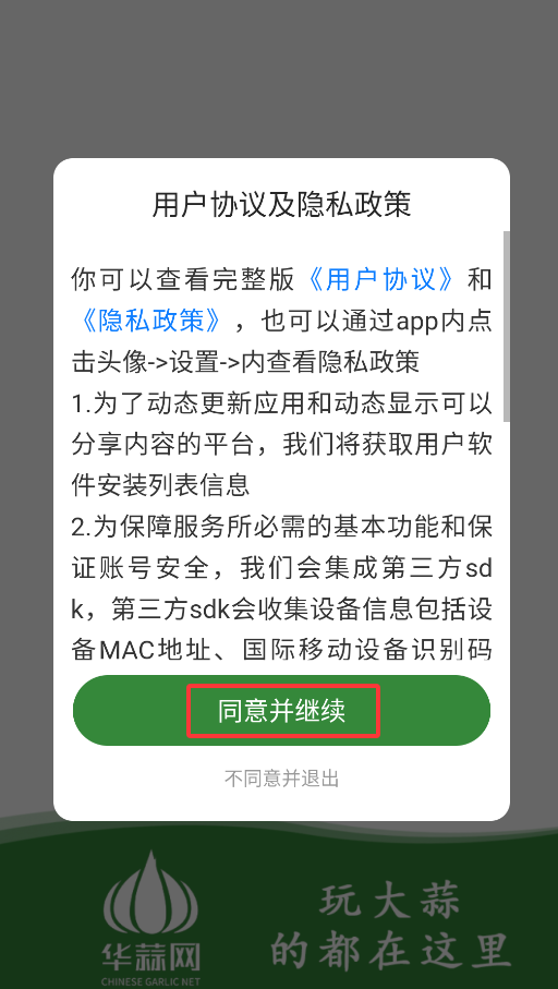 1、首次启动APP会弹出用户协议,点击"同意"后即可进入大蒜产业服务平台主界面。