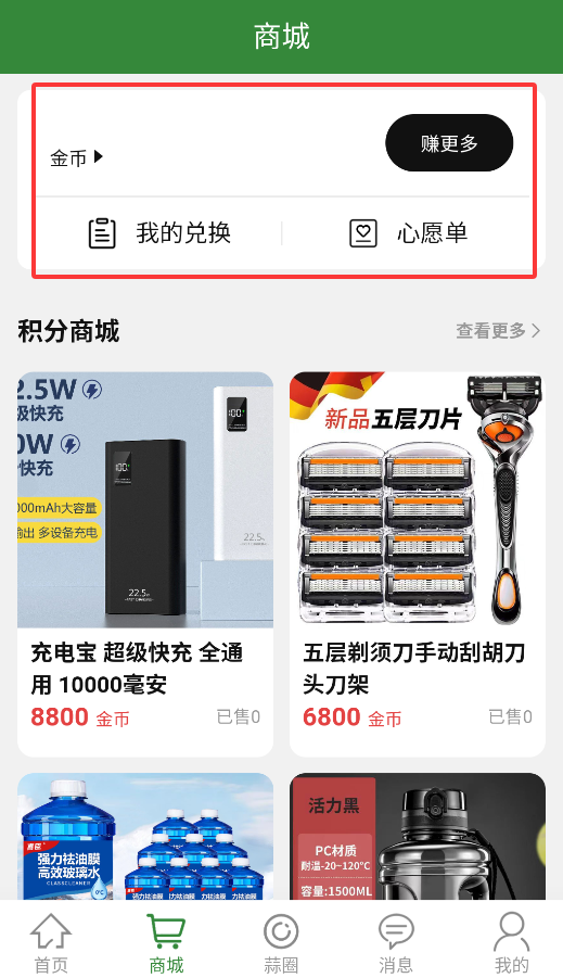 3、商城系统支持金币充值(1:1抵现)、积分兑换商品(需完成每日任务赚积分)及心愿单收藏功能。