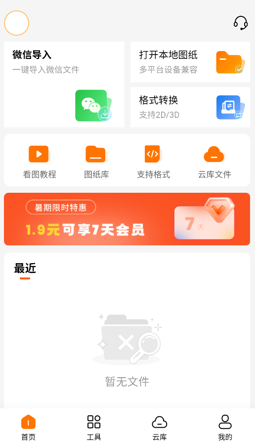 1、启动应用后进入主界面,提供微信文件导入、本地图纸浏览、格式转换、教学视频、图纸库管理等核心功能入口。